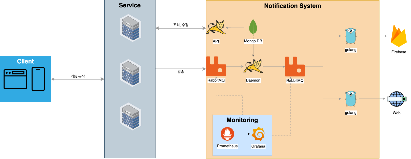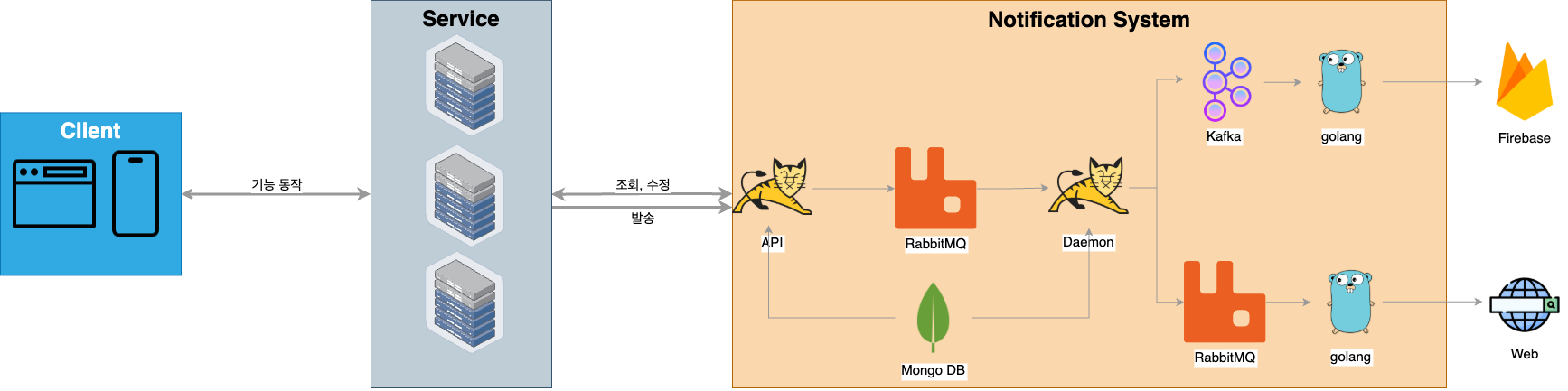더불어, 알림 시스템의 발송량이 수백만 건 규모에 미치지 않으며, 실시간 처리가 중요한 요구사항임을 고려해 Kafka 대신 RabbitMQ로 전환하기로 결정하였습니다. 이를 통해 Kafka를 사용하는 기존 Golang 서버를 RabbitMQ로 통합하여 운영 효율성을 높이고자 합니다.