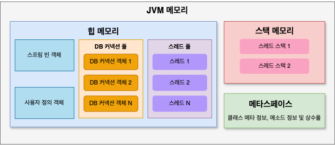 스프링에서 실행되는 빈 객체, 스레드 풀 등이 JVM 메모리에 올라가게 됩니다.