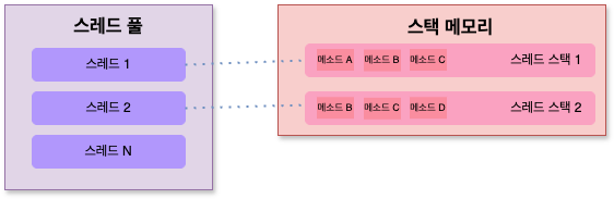 Client에서 요청이 오면 스레드 풀에 있는 스레드가 스택 메모리에 메소드, 지역 변수, 매개 변수 등이 스택 프레임에 쌓여 메모리에 저장됩니다. 요청된 작업이 끝나면 사용한 스택 메모리 영역은 제거되고 스레드 풀에 있는 스레드는 반환되어 다른 요청이 올 때 까지 대기(idle)상태가 됩니다.