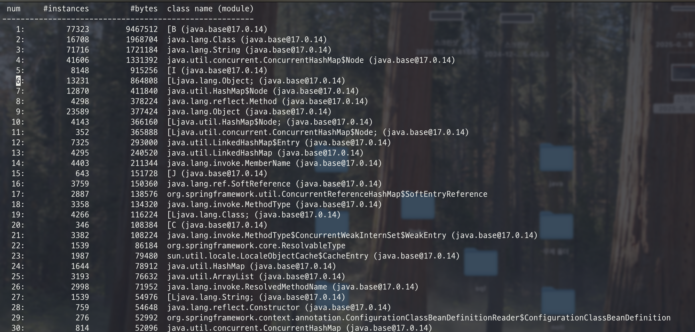 jmap -clstats <pid>: 클래스 로더 통계jmap -finalizerinfo <pid>: Finalizer 큐에 남아있는 객체 목록jmap -histo[:옵션] <pid>: 힙에 존재하는 객체들의 클래스별 개수와 메모리 크기 통계jmap -dump:<옵션> <pid>: 힙 메모리 덤프(.hprof) 파일 생성live: 현재 살이 있는 객체에 대한 집계all: 모든 객체에 대한 집계format=b: 바이러니 형식file=<file>: 덤프 파일 저장gz=<number>: 압축 레벨 지정 (1=빠름, 9=최대 압축)- example: