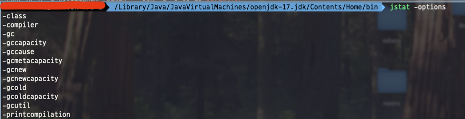 -class: 클래스 로딩/언로딩 통계. 로딩된 클래스 수, 로딩된 바이트 크기, 언로딩된 수-compiler: JIT(Just In Time) 컴파일러 통계. 컴파일된 메서드 수, 총 시간-gc: GC 통계 요약. Yong, Old, Metasapce, GC 횟수/시간-gccapacity: 메모리 크기 정보. 현재 크기, 최대 크기, 커밋된 용량-gccause: GC 발생 원인을 포함한 통계. 마지막 GC 원인, 다음 예정된 GC 원인-gcmetacapacity: metaspace 크기 정보-gcnew: New 영역(Eden, Survivor) GC 통계-gcnewcapacity: New 영역 크기 정보-gcold: Old 영역 GC 통계-gcoldcapacity: Old 영역 크기 정보-gcutil: 각 영역의 사용률, GC 횟수/시간 통계-printcompilation: JIT(Just In Time) 컴파일된 메소드 목록 출력