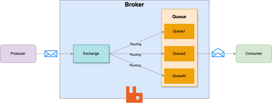 프로듀서에서 메세지를 보내면 브로커의 Exchange로 보내집니다. Exchange는 Exchange Type을 확인하여 Queue에 메시지 복사본을 라우팅하는 역할을 합니다.