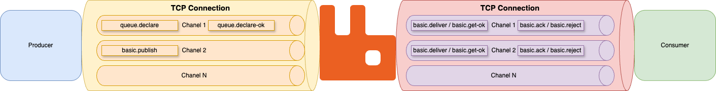 대부분 메서드는 요청과 응답으로 쌍을 형성합니다. 예를 들어, 프로듀서나 컨슈머가 브로커에게 새로운 Exchange을 선언 요청(exchange.declare)보내면 브로커에서 작업이 끝난 후 응답(exchange.delcare-ok )합니다. basic.publish 는 응답이 없는 메서드이며 쌍을 형성하지 않습니다.