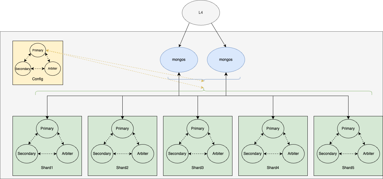mongos 2대, shard 5대, config3대로 구성되어 운영중입니다.