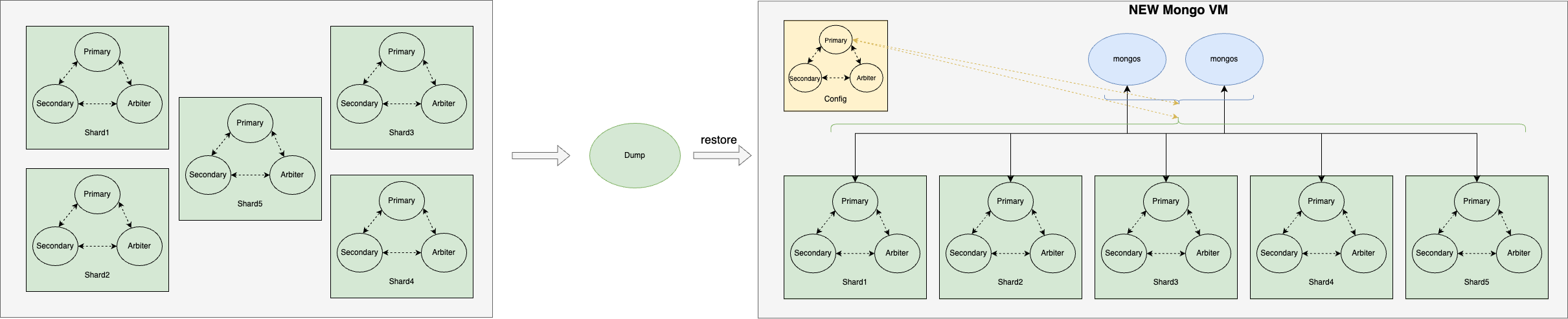 재구성하기 위한 전략은 기존 mongoDB를 dump이후 새로운 mongoDB VM에 restore이후 샤딩키를 재구성하기로 하였습니다. 안전한 재구성을 위해 새로운 mongoDB에 restore이후 문제가 발생하면 이전 mongo DB VM으로 롤백하기로 했습니다.