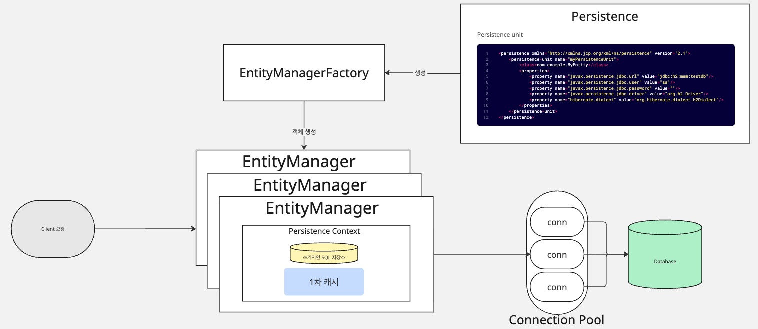 EntityManagerFactory를 통해 사용자 요청 1개당 1개씩 생성되며, DB 커넥션풀을 통해 DB에 CRUD를 요청합니다. 이때, 하나의 트랜잭션에는 한개의 EntityManager만 존재 할 수 있습니다.