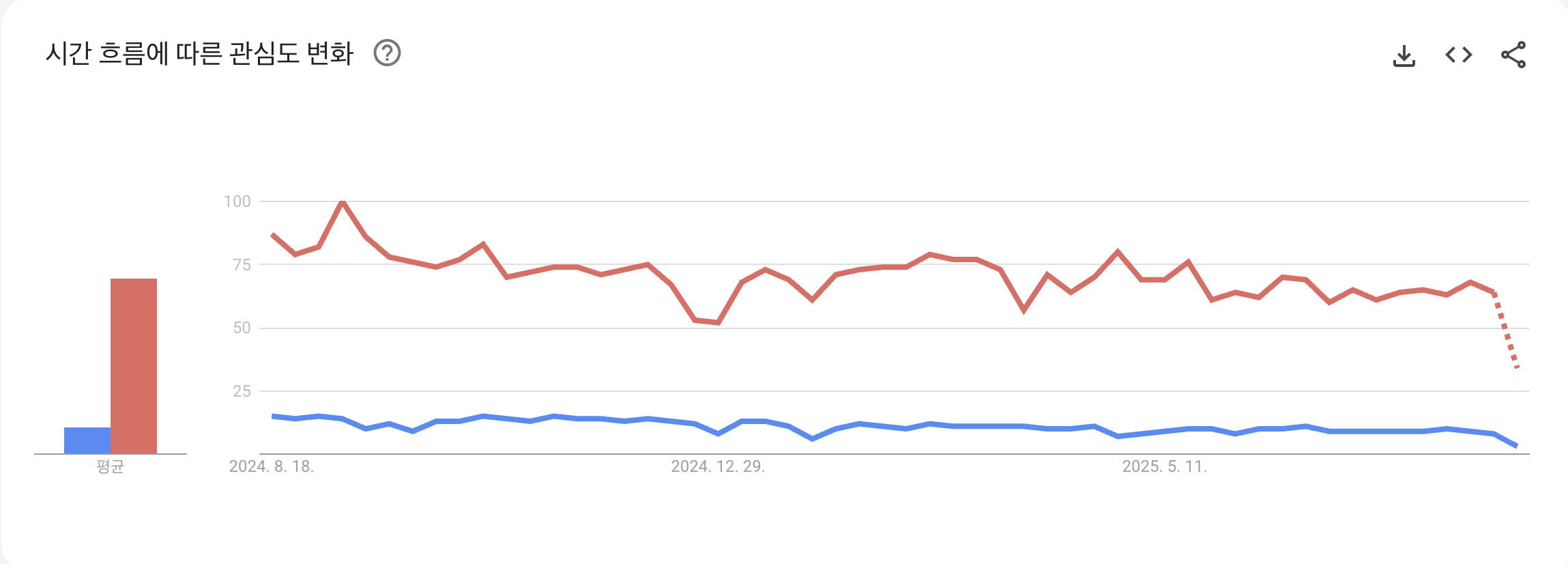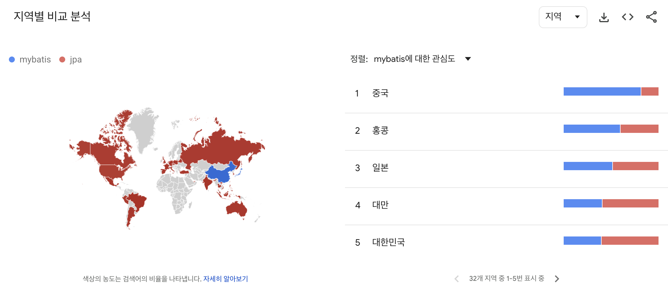 구글 트랜드로 보면 전 세계적으로 Mybatis보다 JPA를 많이 사용중인걸로 보입니다. 한국에서도 아직 Mybatis를 많이 사용중인걸로 확인되네요, 레거시한 서비스들이 많이 있다는 거겠죠 😢