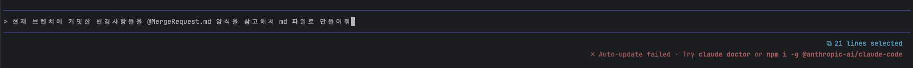 이러한 문제점을 해결하기 위해 Claud Code CLI를 사용하여 자동화 하기로 하였습니다. CLI이점은 @명령어를 통해 특정 파일을 지정할 수 있습니다. 위에 MR 양식을 프로젝트에 md파일로 만들어 자동화 하였습니다.