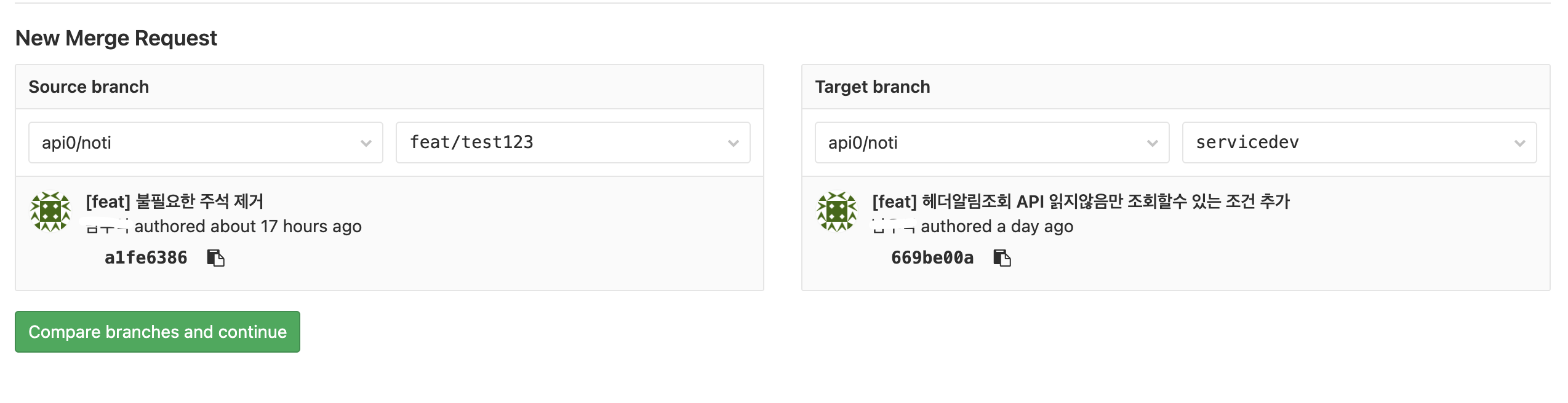 해당 양식으로도 잘 사용하고 있었지만 개발자가 명령어를 매번 쳐야하고 gitlab에 MR를 자동으로 만들어주지 않기 때문에 gitlab 프로젝트에 들어가 New Merge Request 버튼을 클릭하여 Source branch와 Target branch를 선택해야하는 문제점이 있었습니다.