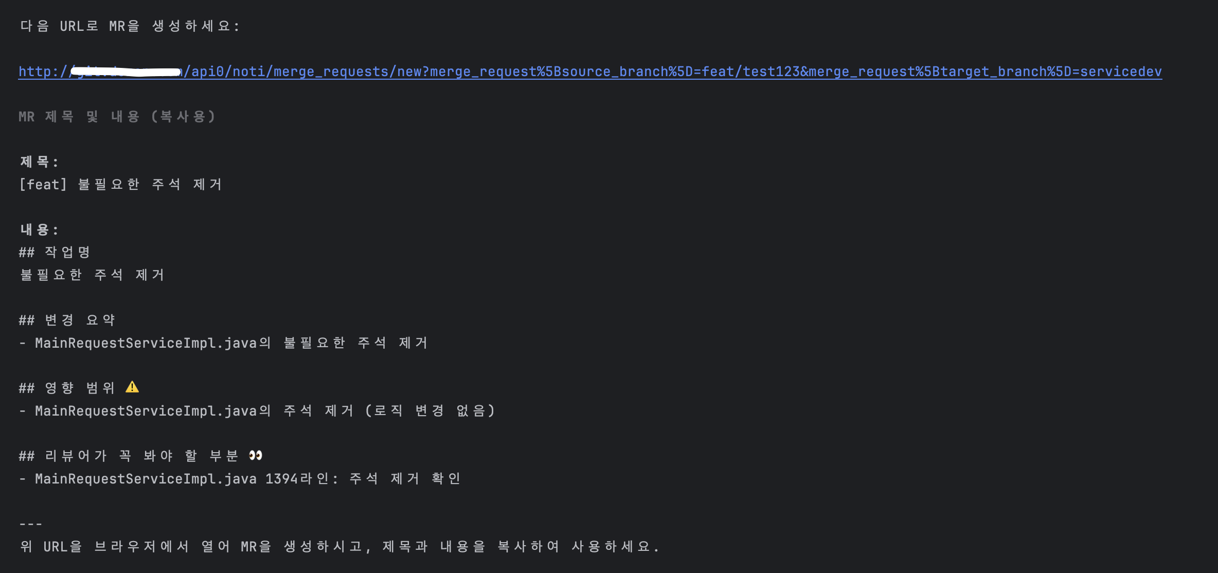 - MR 생성 URL과 변경사항 Markdown 형태로 리턴